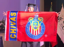 En plena graduación celebró con la bandera de las Chivas! 🎓⚽